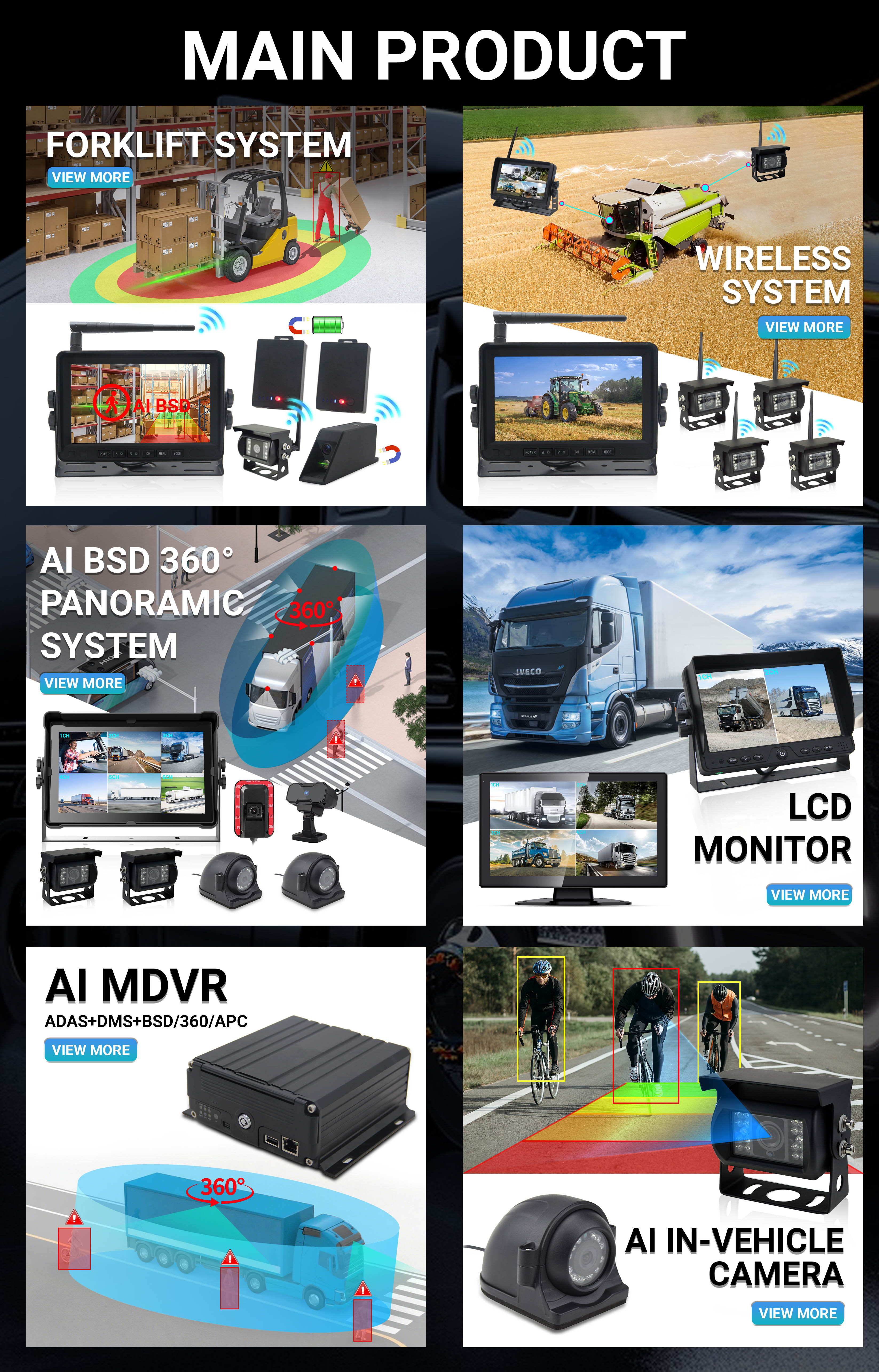 Productos principales:Sistema de monitoreo de vehículos, sistema de cámara AI, sistema de gestión de flotas de montacargas, cámara de camión/monitor de camión, cables de coche